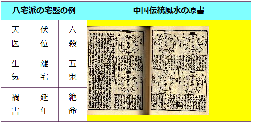 陽宅風水には、八宅派・九星派・飛星派・玄空派・奇門派・星度派等、数多くの派が存在する。ここでは最もポピュラー な八宅派の宅盤の例を下に紹介しておく。
